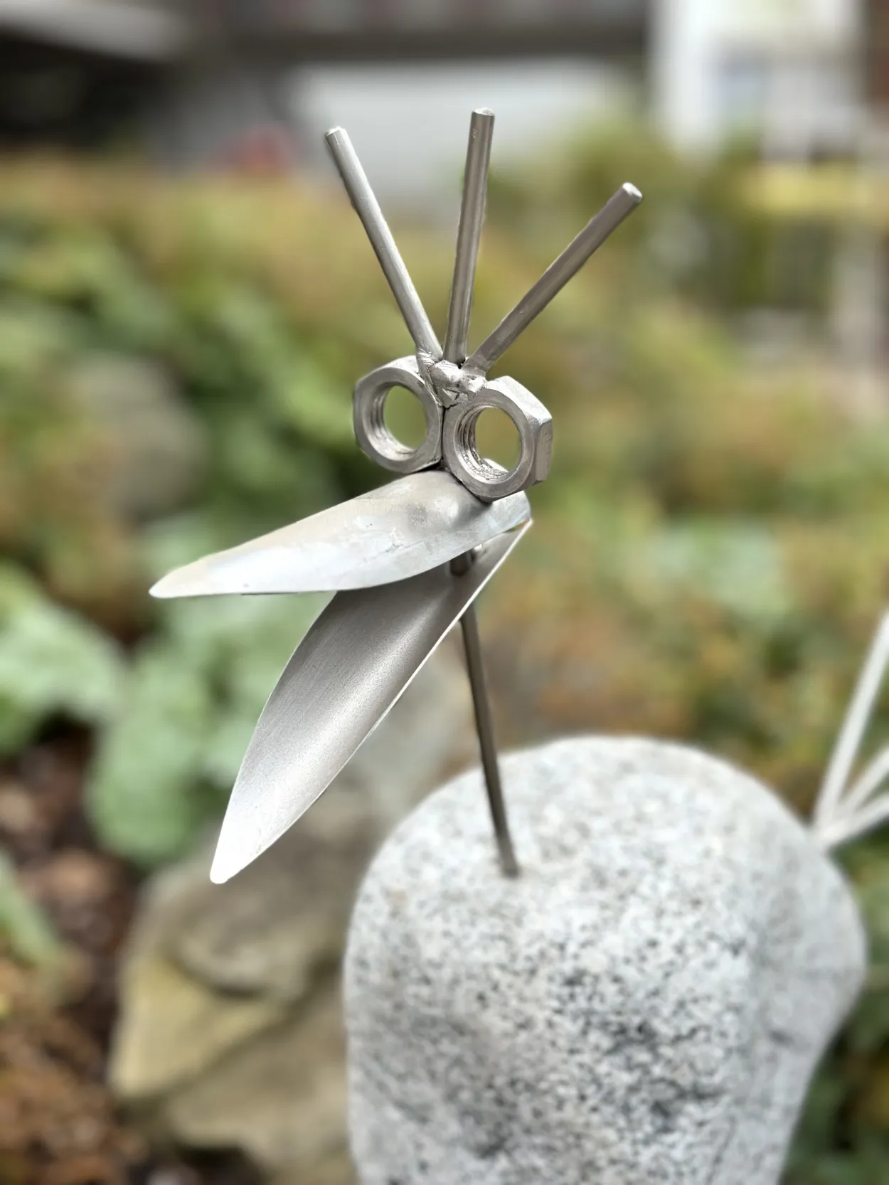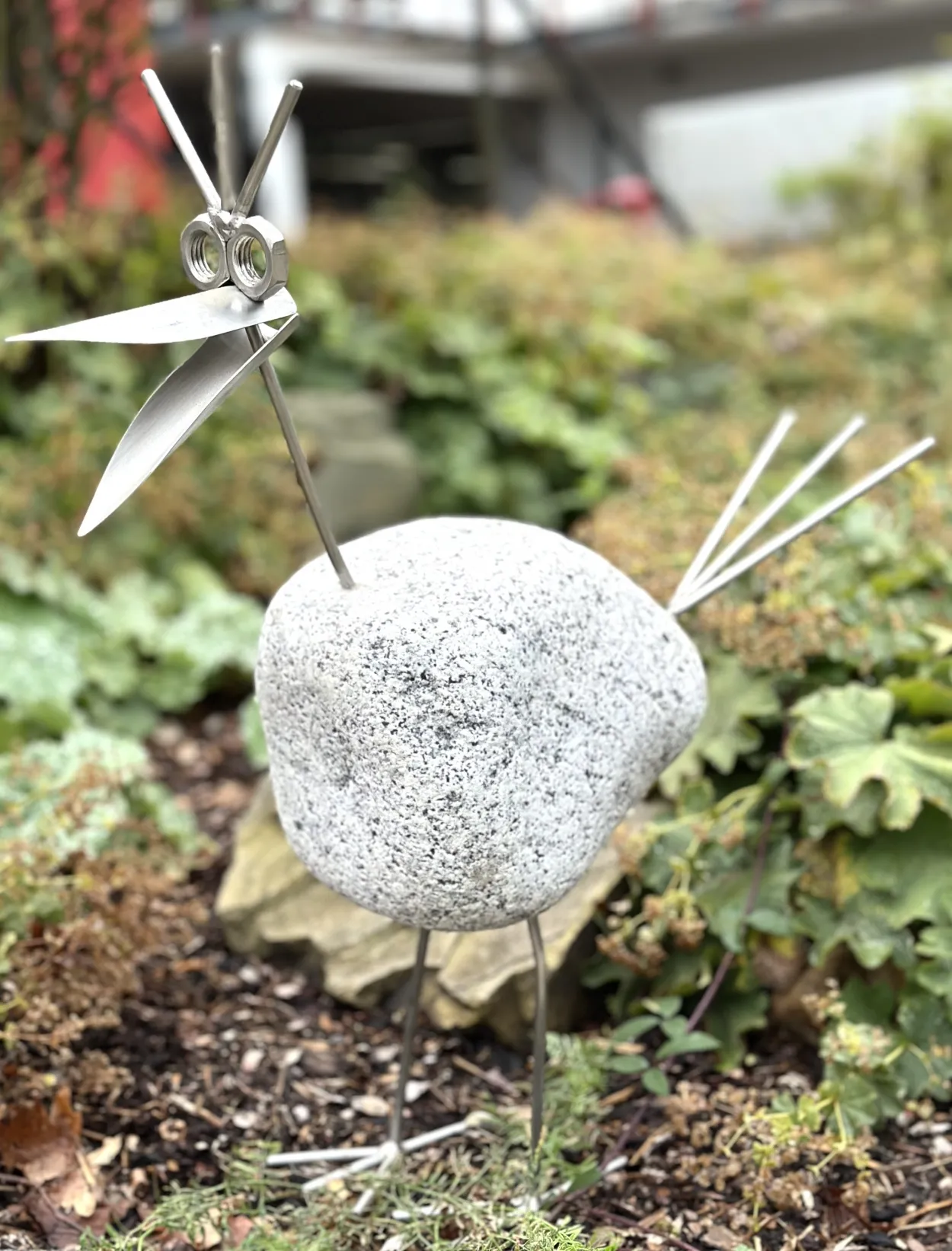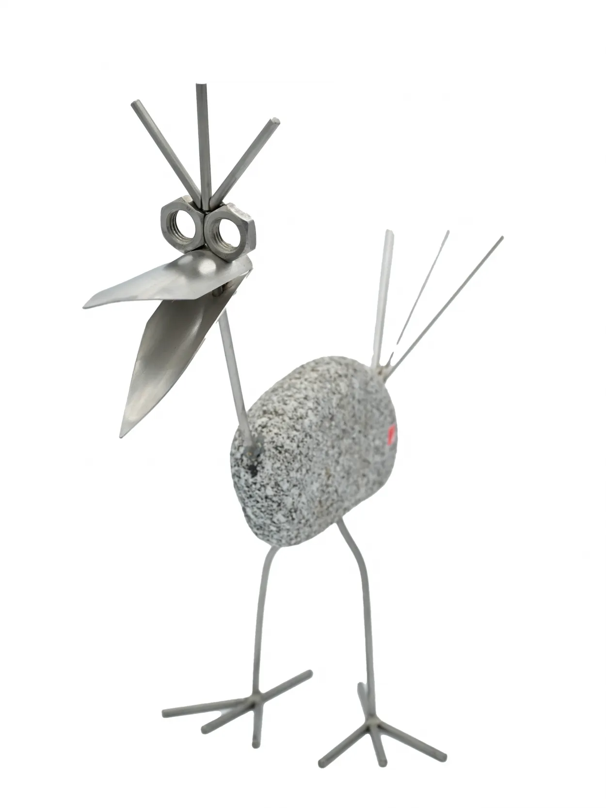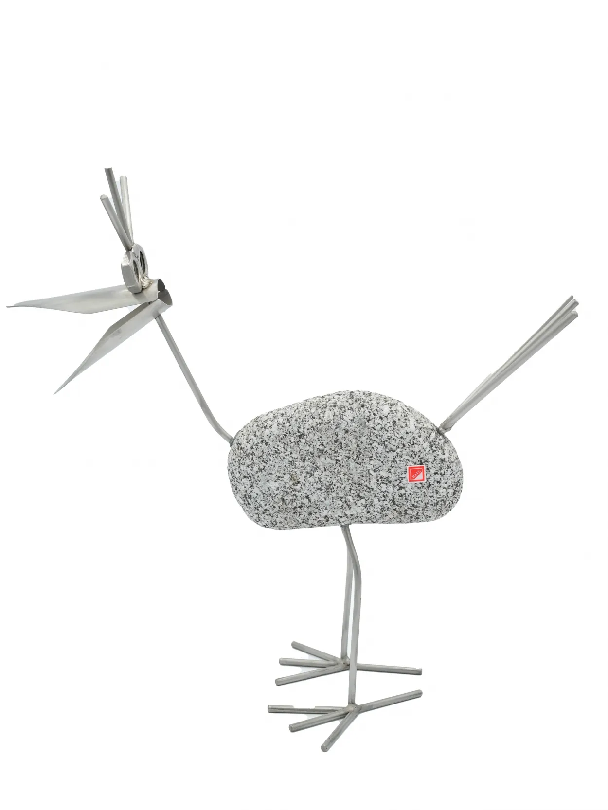 Witzige handgefertigte Vogelfigur für in- und outdoor. Der Korpus ist aus hellen Granitkiesel, Kopf, Schwanz und Füße sind aus Edelstahl hergestellt.